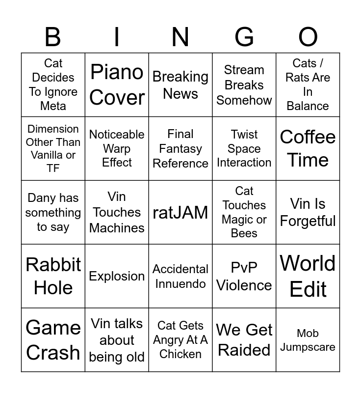 This bingo card has a free space and 24 words: Explosion, Vin talks about being old, Final Fantasy Reference, Game Crash, Cats / Rats Are In Balance, Cat Decides To Ignore Meta, Dimension Other Than Vanilla or TF, Piano Cover, Cat Touches Magic or Bees, Accidental Innuendo, Twist Space Interaction, Dany has something to say, PvP Violence, World Edit, Noticeable Warp Effect, We Get Raided, Vin Is Forgetful, Breaking News, Coffee Time, Vin Touches Machines, Mob Jumpscare, Rabbit Hole, Stream Breaks Somehow and Cat Gets Angry At A Chicken.