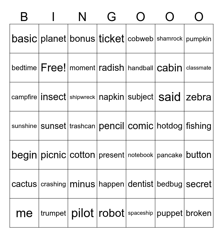 This bingo card has a free space and 48 words: dentist, cabin, robot, sunset, shipwreck, fishing, planet, trumpet, shamrock, present, pumpkin, ticket, said, subject, cactus, hotdog, bedtime, classmate, bedbug, cobweb, handball, trashcan, basic, Free!, secret, moment, zebra, me, napkin, insect, puppet, comic, button, crashing, sunshine, notebook, pancake, campfire, cotton, minus, begin, broken, bonus, pilot, radish, happen, picnic and spaceship.