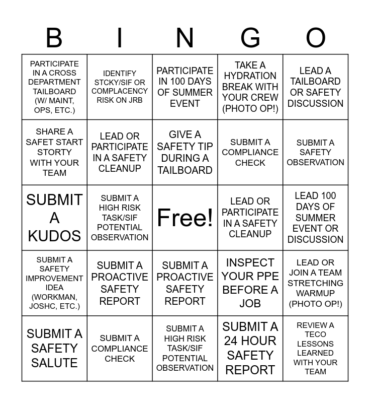 This bingo card has a free space and 24 words: SUBMIT A PROACTIVE SAFETY REPORT, SUBMIT A COMPLIANCE CHECK, GIVE A SAFETY TIP DURING A TAILBOARD, SUBMIT A SAFETY SALUTE, LEAD A TAILBOARD OR SAFETY DISCUSSION, PARTICIPATE IN A CROSS DEPARTMENT TAILBOARD (W/ MAINT, OPS, ETC.), SHARE A SAFET START STORTY WITH YOUR TEAM, IDENTIFY STCKY/SIF OR COMPLACENCY RISK ON JRB, LEAD OR PARTICIPATE IN A SAFETY CLEANUP, SUBMIT A PROACTIVE SAFETY REPORT, SUBMIT A COMPLIANCE CHECK, SUBMIT A KUDOS, INSPECT YOUR PPE BEFORE A JOB, LEAD OR JOIN A TEAM STRETCHING WARMUP (PHOTO OP!), LEAD OR PARTICIPATE IN A SAFETY CLEANUP, SUBMIT A 24 HOUR SAFETY REPORT, LEAD 100 DAYS OF SUMMER EVENT OR DISCUSSION, PARTICIPATE IN 100 DAYS OF SUMMER EVENT, SUBMIT A SAFETY OBSERVATION, SUBMIT A HIGH RISK TASK/SIF POTENTIAL OBSERVATION, REVIEW A TECO LESSONS LEARNED WITH YOUR TEAM, SUBMIT A SAFETY IMPROVEMENT IDEA (WORKMAN, JOSHC, ETC.), TAKE A HYDRATION BREAK WITH YOUR CREW (PHOTO OP!) and SUBMIT A HIGH RISK TASK/SIF POTENTIAL OBSERVATION.