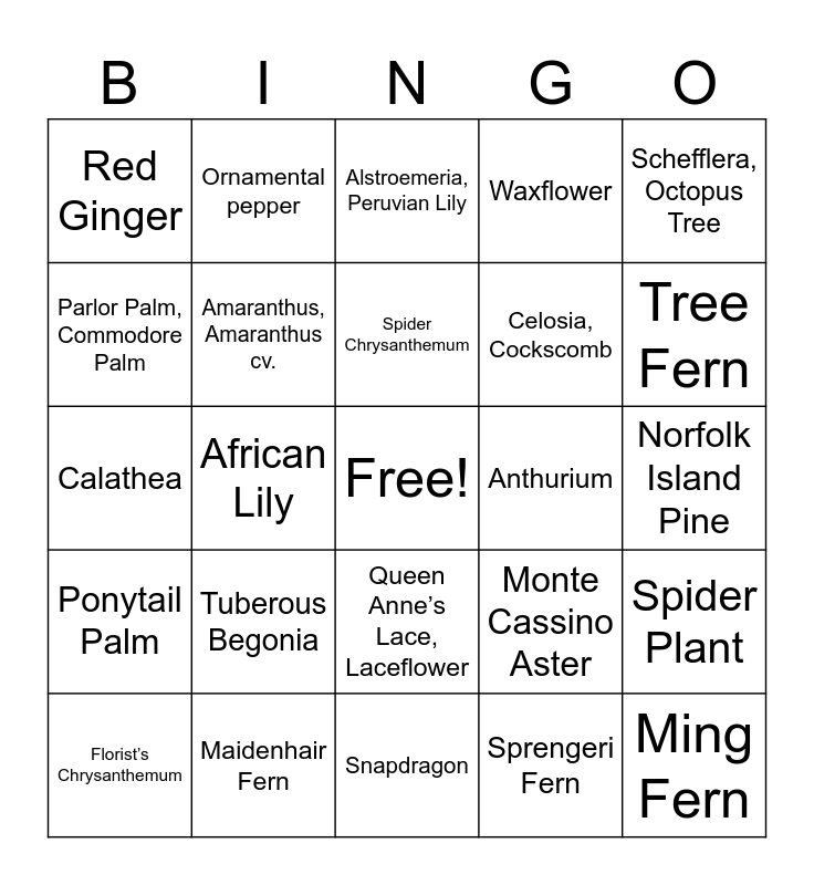 This bingo card has a free space and 30 words: Maidenhair Fern, Bromeliad, African Lily, Aglaonema, Chinese Evergreen, Red Ginger, Alstroemeria, Peruvian Lily, Amaranthus, Amaranthus cv., Queen Anne’s Lace, Laceflower, Anthurium, Snapdragon, Norfolk Island Pine, Ming Fern, Sprengeri Fern, Plumosa Fern, Tree Fern, Bird’s Nest Fern, Monte Cassino Aster, Ponytail Palm, Tuberous Begonia, Schefflera, Octopus Tree, Calathea, Chinese Aster, Ornamental pepper, Celosia, Cockscomb, Parlor Palm, Commodore Palm, Waxflower, Spider Plant, Florist’s Chrysanthemum, Spider Chrysanthemum and Croton.