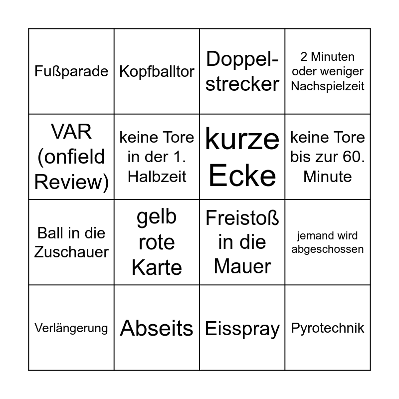 This bingo card has 44 words: Arnautovic spielt, Verlängerung, Elfmeter, Rote Karte, Karte für die Bank, Aluminium, Doppel-strecker, Schwalbe, VAR (onfield Review), mehr als 5 Minuten Nachspielzeit, 2 Minuten oder weniger Nachspielzeit, Abseits, Doppelpack, Flitzer, guade Oide, Einwurf, Ecke, Freistoß in die Mauer, Jemand liegt hinter der Mauer beim Freistoß, gelb rote Karte, Kopfballtor, Tor, Faustabwehr, Fußparade, Ultra Wurzn, Eisspray, Behandlung am Feld, "Finale dahoam" wird erwähnt, Zanetti oder Ibra wird eingeblendet, Pyrotechnik, MNM wird erwähnt, gelbe Karte, Stream steht still, Handspiel, jemand wird abgeschossen, Wechsel vor der Halbzeit, Dreifach-wechsel, Doppel-wechsel, keine Tore bis zur 60. Minute, keine Tore in der 1. Halbzeit, Ball in die Zuschauer, Einwurf in den 16er, kurze Ecke and Abstoß.