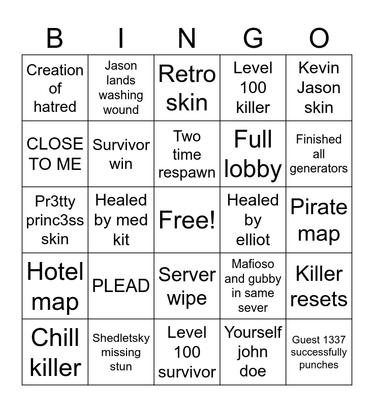 This bingo card has a free space and 24 words: PLEAD, Shedletsky missing stun, Two time respawn, Chill killer, Kevin Jason skin, Creation of hatred, CLOSE TO ME, Jason lands washing wound, Healed by elliot, Server wipe, Full lobby, Pr3tty princ3ss skin, Mafioso and gubby in same sever, Killer resets, Survivor win, Yourself john doe, Pirate map, Retro skin, Finished all generators, Healed by med kit, Guest 1337 successfully punches, Hotel map, Level 100 killer and Level 100 survivor.