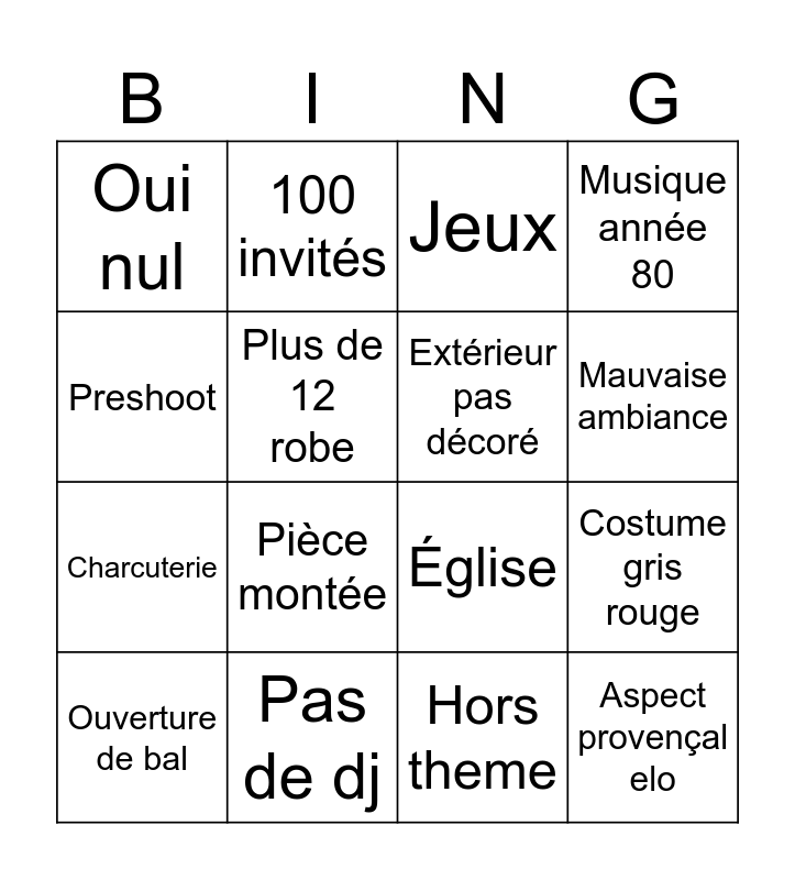 This bingo card has 16 words: Pas de dj, Costume gris rouge, Jeux, Oui nul, Charcuterie, 100 invités, Église, Hors theme, Preshoot, Plus de 12 robe, Ouverture de bal, Musique année 80, Pièce montée, Mauvaise ambiance, Extérieur pas décoré and Aspect provençal elo.
