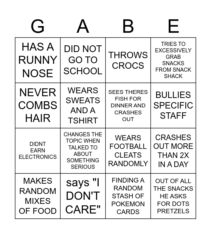 This bingo card has 16 words: says "I DON'T CARE", CRASHES OUT MORE THAN 2X IN A DAY, THROWS CROCS, HAS A RUNNY NOSE, DIDNT EARN ELECTRONICS, DID NOT GO TO SCHOOL, WEARS FOOTBALL CLEATS RANDOMLY, FINDING A RANDOM STASH OF POKEMON CARDS, NEVER COMBS HAIR, WEARS SWEATS AND A TSHIRT, MAKES RANDOM MIXES OF FOOD, TRIES TO EXCESSIVELY GRAB SNACKS FROM SNACK SHACK, CHANGES THE TOPIC WHEN TALKED TO ABOUT SOMETHING SERIOUS, BULLIES SPECIFIC STAFF, SEES THERES FISH FOR DINNER AND CRASHES OUT and OUT OF ALL THE SNACKS HE ASKS FOR DOTS PRETZELS.