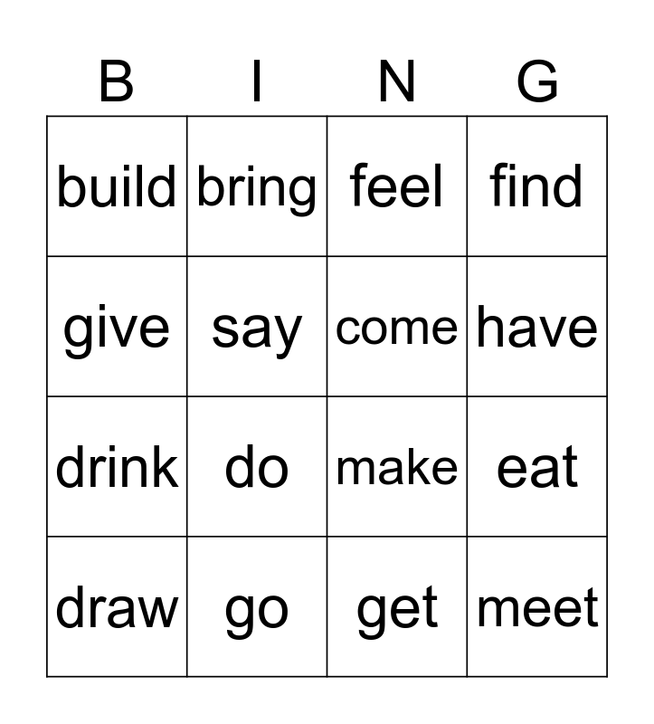 This bingo card has 16 words: go, eat, feel, build, drink, bring, make, get, give, say, draw, find, do, have, come and meet.