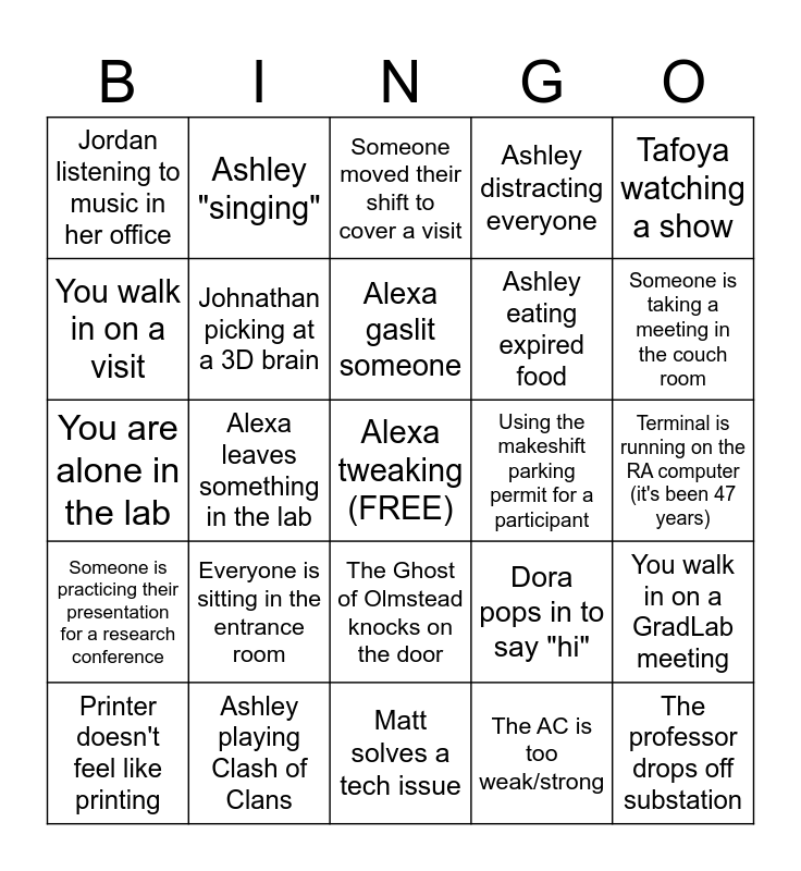 This bingo card has a free space and 24 words: Everyone is sitting in the entrance room, Ashley playing Clash of Clans, Alexa gaslit someone, Printer doesn't feel like printing, Tafoya watching a show, Jordan listening to music in her office, You walk in on a visit, Ashley "singing", Using the makeshift parking permit for a participant, The Ghost of Olmstead knocks on the door, Ashley eating expired food, You are alone in the lab, Dora pops in to say "hi", You walk in on a GradLab meeting, Johnathan picking at a 3D brain, The AC is too weak/strong, Terminal is running on the RA computer (it's been 47 years), Someone moved their shift to cover a visit, Someone is taking a meeting in the couch room, Alexa leaves something in the lab, The professor drops off substation, Someone is practicing their presentation for a research conference, Ashley distracting everyone and Matt solves a tech issue.