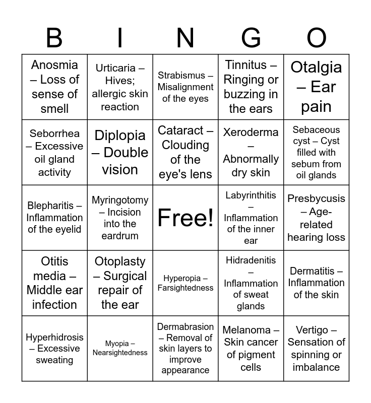 This bingo card has a free space and 40 words: Ophthalmoscopy – Examination of the interior of the eye, Blepharitis – Inflammation of the eyelid, Retinopathy – Disease of the retina, Diplopia – Double vision, Myopia – Nearsightedness, Hyperopia – Farsightedness, Cataract – Clouding of the eye's lens, Glaucoma – Eye disease causing increased intraocular pressure, Otalgia – Ear pain, Otitis media – Middle ear infection, Myringotomy – Incision into the eardrum, Tinnitus – Ringing or buzzing in the ears, Vertigo – Sensation of spinning or imbalance, Presbycusis – Age-related hearing loss, Labyrinthitis – Inflammation of the inner ear, Otoplasty – Surgical repair of the ear, Rhinoplasty – Surgical reshaping of the nose, Anosmia – Loss of sense of smell, Ageusia – Loss of sense of taste, Strabismus – Misalignment of the eyes, Dermatitis – Inflammation of the skin, Melanoma – Skin cancer of pigment cells, Xeroderma – Abnormally dry skin, Seborrhea – Excessive oil gland activity, Psoriasis – Autoimmune skin disorder with scaling, Cellulitis – Bacterial skin infection, Alopecia – Hair loss, Trichomycosis – Fungal infection of hair, Onychomycosis – Fungal infection of nails, Onycholysis – Separation of the nail from the nail bed, Paronychia – Infection of the nail fold, Hyperhidrosis – Excessive sweating, Anhidrosis – Inability to sweat normally, Hidradenitis – Inflammation of sweat glands, Sebaceous cyst – Cyst filled with sebum from oil glands, Dermabrasion – Removal of skin layers to improve appearance, Impetigo – Contagious skin infection with pustules and crusting, Eczema – Chronic itchy inflammation of the skin, Urticaria – Hives; allergic skin reaction and Abscess – Localized collection of pus.