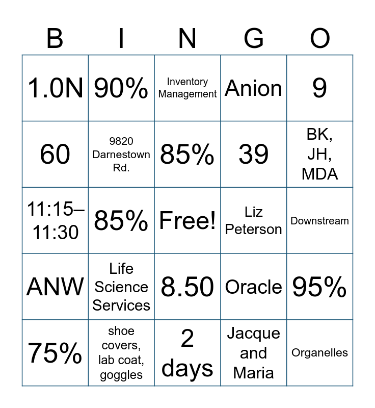 This bingo card has a free space and 30 words: shoe covers, lab coat, goggles, 4, 85%, 0.5N, 1.0N, Inventory Management, 9820 Darnestown Rd., 8.50, Liz Peterson, 2 days, Downstream, Organelles, Jacque and Maria, 2, BK, JH, MDA, SP, Oracle, ANW, Life Science Services, 9, 11:15–11:30, 5, 90%, 39, 60, Anion, 95%, 75%, 85% and Wednesday.