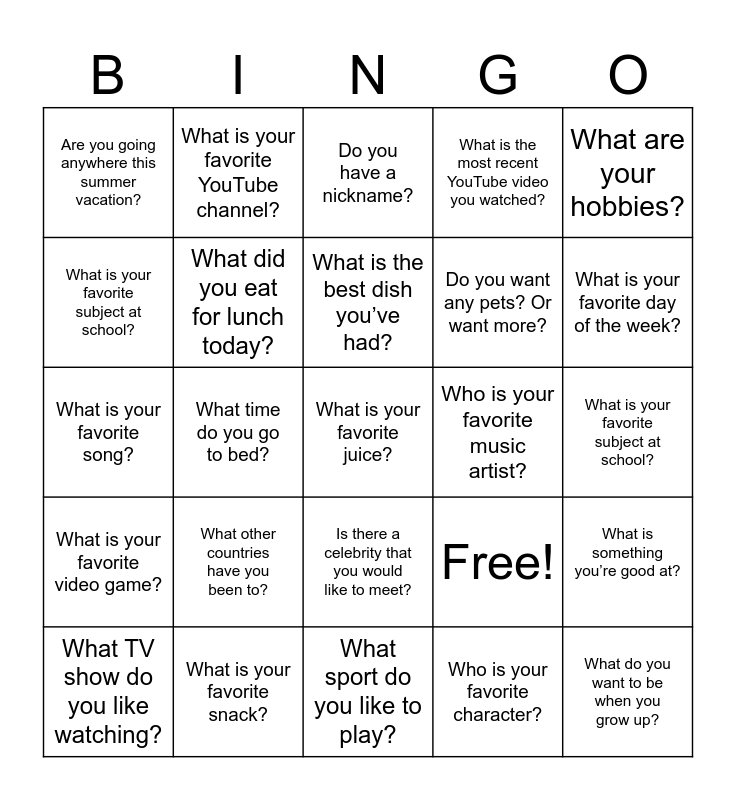 This bingo card has 25 words: What other countries have you been to?, What sport do you like to play?, What is the best dish you’ve had?, What TV show do you like watching?, What are your hobbies?, Are you going anywhere this summer vacation?, What is your favorite subject at school?, What is your favorite YouTube channel?, Who is your favorite music artist?, Is there a celebrity that you would like to meet?, Do you want any pets? Or want more?, What is your favorite song?, Free!, What is something you’re good at?, What did you eat for lunch today?, What do you want to be when you grow up?, What is your favorite subject at school?, Do you have a nickname?, What is your favorite day of the week?, What time do you go to bed?, What is your favorite juice?, What is your favorite snack?, What is your favorite video game?, What is the most recent YouTube video you watched? and Who is your favorite character?.