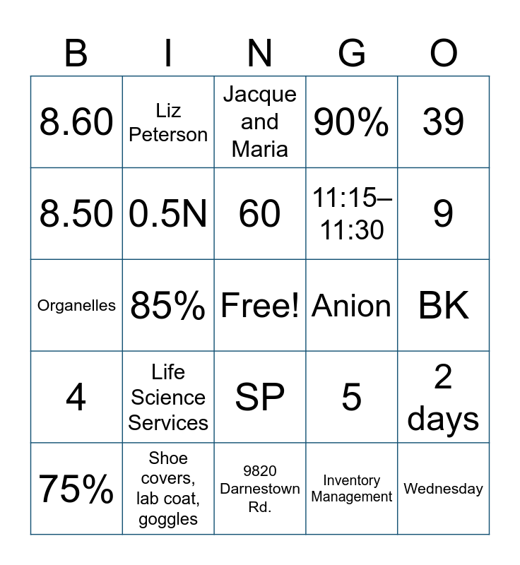 This bingo card has a free space and 29 words: 75%, Oracle, 85%, 2, 8.60, Jacque and Maria, 0.5N, Life Science Services, Anion, Shoe covers, lab coat, goggles, BK, Wednesday, 9820 Darnestown Rd., Inventory Management, 9, Downstream, SP, 4, 39, Organelles, 5, 95%, 11:15–11:30, 8.50, 90%, Liz Peterson, 2 days, 60 and ANW.