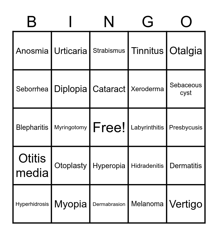 This bingo card has a free space and 40 words: Ophthalmoscopy, Blepharitis, Retinopathy, Diplopia, Myopia, Hyperopia, Cataract, Glaucoma, Otalgia, Otitis media, Myringotomy, Tinnitus, Vertigo, Presbycusis, Labyrinthitis, Otoplasty, Rhinoplasty, Anosmia, Ageusia, Strabismus, Dermatitis, Melanoma, Xeroderma, Seborrhea, Psoriasis, Cellulitis, Alopecia, Trichomycosis, Onychomycosis, Onycholysis, Paronychia, Hyperhidrosis, Anhidrosis, Hidradenitis, Sebaceous cyst, Dermabrasion, Impetigo, Eczema, Urticaria and Abscess.