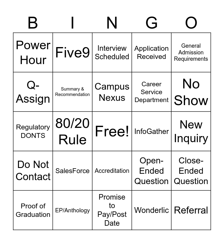 This bingo card has a free space and 24 words: SalesForce, EP/Anthology, Campus Nexus, Proof of Graduation, General Admission Requirements, Power Hour, Q-Assign, Five9, InfoGather, Accreditation, Career Service Department, Regulatory DONTS, Open-Ended Question, Close-Ended Question, Summary & Recommendation, Wonderlic, New Inquiry, Interview Scheduled, No Show, 80/20 Rule, Referral, Do Not Contact, Application Received and Promise to Pay/Post Date.