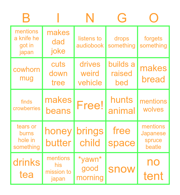 This bingo card has a free space and 25 words: honey butter, *yawn* good morning, drives weird vehicle, drinks tea, forgets something, mentions a knife he got in japan, cowhorn mug, makes dad joke, hunts animal, brings child, builds a raised bed, finds crowberries, free space, mentions Japanese spruce beatle, cuts down tree, makes fire, mentions wolves, listens to audiobook, makes bread, makes beans, no tent, mentions his mission to japan, tears or burns hole in something, drops something and snow.