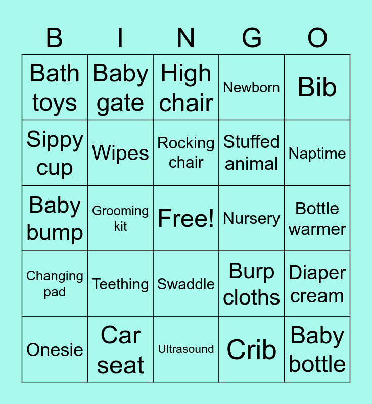 This bingo card has a free space and 44 words: Diapers, Baby bottle, Pacifier, Onesie, Stroller, Crib, High chair, Baby monitor, Bib, Car seat, Newborn, Nursery, Swaddle, Teething, Baby shower, Ultrasound, Due date, Baby bump, Feeding, Naptime, Baby gate, Baby swing, Bassinet, Bath toys, Bottle brush, Bottle warmer, Bouncer, Breast pump, Burp cloths, Changing pad, Diaper bag, Diaper cream, Floor seat, Gas drops, Grooming kit, Hooded towel, Hook-on toy, Play mat, Rocking chair, Sippy cup, Stuffed animal, Tummy time mat, Wipes and Sister.