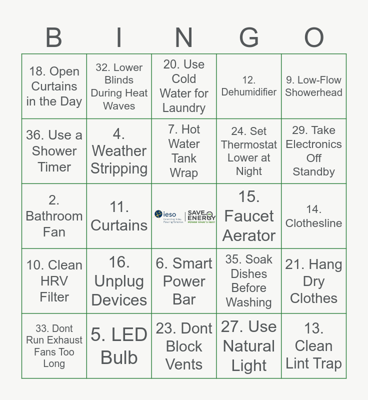 This bingo card has a free space and 41 words: 1. Attic Insulation, 2. Bathroom Fan, 3. Programmable Thermostat, 4. Weather Stripping, 5. LED Bulb, 6. Smart Power Bar, 7. Hot Water Tank Wrap, 8. Pipe Insulation, 9. Low-Flow Showerhead, 10. Clean HRV Filter, 11. Curtains, 12. Dehumidifier, 13. Clean Lint Trap, 14. Clothesline, 15. Faucet Aerator, 16. Unplug Devices, 17. Close Doors, 18. Open Curtains in the Day, 19. Close Curtains at Night, 20. Use Cold Water for Laundry, 21. Hang Dry Clothes, 22. Wait for Full Loads, 23. Dont Block Vents, 24. Set Thermostat Lower at Night, 25. Clean Lint Trap, 26. Wash Dishes in Batches, 27. Use Natural Light, 28. Vacuum Fridge Coils, 29. Take Electronics Off Standby, 30. Use Task Lighting, 31. Keep Fridge Door Closed, 32. Lower Blinds During Heat Waves, 33. Dont Run Exhaust Fans Too Long, 34. Sleep with a Blanket, Not the Thermostat, 35. Soak Dishes Before Washing, 36. Use a Shower Timer, 37. Set your refrigerator to 4°C and your freezer to -18°C, 38. Look for ENERGY STAR appliances, 39. Close Chimney Flue, 40. Turn Off Porch Lights and 41. Ultra-Low Overnight.