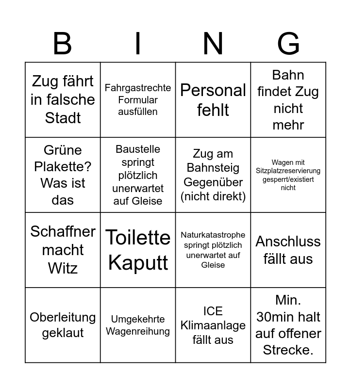 This bingo card has 16 words: Umgekehrte Wagenreihung, Anschluss fällt aus, Personal fehlt, Zug fährt in falsche Stadt, Schaffner macht Witz, Fahrgastrechte Formular ausfüllen, Naturkatastrophe springt plötzlich unerwartet auf Gleise, ICE Klimaanlage fällt aus, Grüne Plakette? Was ist das, Baustelle springt plötzlich unerwartet auf Gleise, Oberleitung geklaut, Bahn findet Zug nicht mehr, Toilette Kaputt, Wagen mit Sitzplatzreservierung gesperrt/existiert nicht, Zug am Bahnsteig Gegenüber (nicht direkt) and Min. 30min halt auf offener Strecke..