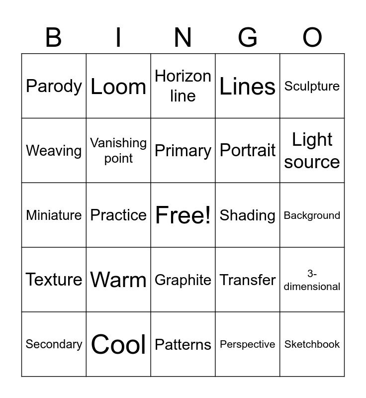 This bingo card has a free space and 24 words: Warm, Cool, Primary, Secondary, Sculpture, Parody, Weaving, Loom, Shading, Graphite, Portrait, Miniature, Transfer, 3-dimensional, Vanishing point, Perspective, Background, Horizon line, Light source, Practice, Sketchbook, Texture, Lines and Patterns.