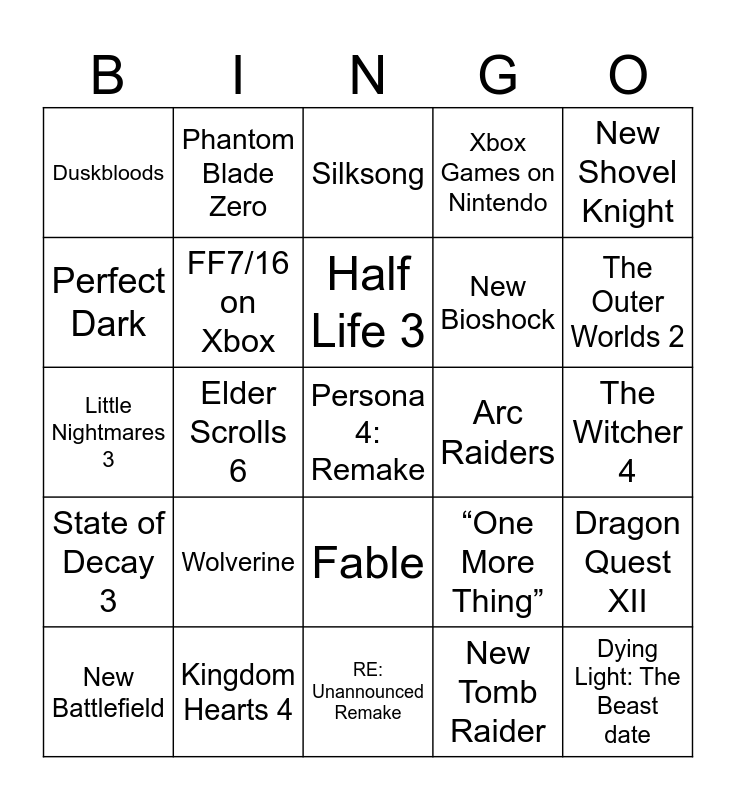 This bingo card has 25 words: Wolverine, RE: Unannounced Remake, Half Life 3, New Battlefield, New Shovel Knight, Duskbloods, Perfect Dark, Phantom Blade Zero, Arc Raiders, Fable, New Bioshock, Little Nightmares 3, “One More Thing”, Dragon Quest XII, FF7/16 on Xbox, Dying Light: The Beast date, The Witcher 4, Silksong, The Outer Worlds 2, Elder Scrolls 6, Persona 4: Remake, Kingdom Hearts 4, State of Decay 3, Xbox Games on Nintendo and New Tomb Raider.
