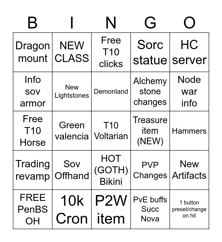 This bingo card has a free space and 24 words: Sov Offhand, 10k Cron, Demonland, FREE PenBS OH, HC server, Dragon mount, Info sov armor, NEW CLASS, Treasure item (NEW), HOT (GOTH) Bikini, Alchemy stone changes, Free T10 Horse, PVP Changes, New Artifacts, New Lightstones, PvE buffs Succ Nova, Hammers, Free T10 clicks, Node war info, Green valencia, 1 button preset/change on hit, Trading revamp, Sorc statue and P2W item.