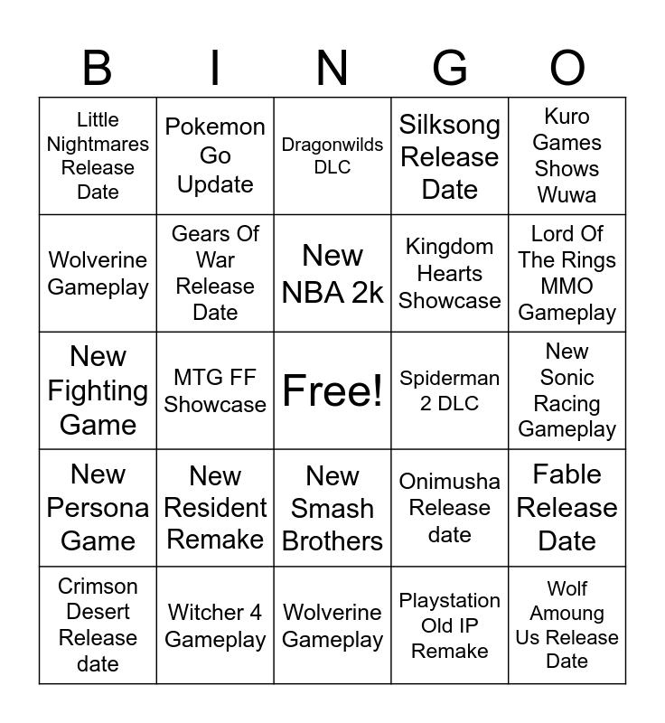 This bingo card has a free space and 24 words: New Resident Remake, Witcher 4 Gameplay, New NBA 2k, Crimson Desert Release date, Kuro Games Shows Wuwa, Little Nightmares Release Date, Wolverine Gameplay, Pokemon Go Update, Spiderman 2 DLC, New Smash Brothers, Kingdom Hearts Showcase, New Fighting Game, Onimusha Release date, Fable Release Date, Gears Of War Release Date, Playstation Old IP Remake, New Sonic Racing Gameplay, Dragonwilds DLC, Lord Of The Rings MMO Gameplay, MTG FF Showcase, Wolf Amoung Us Release Date, New Persona Game, Silksong Release Date and Wolverine Gameplay.