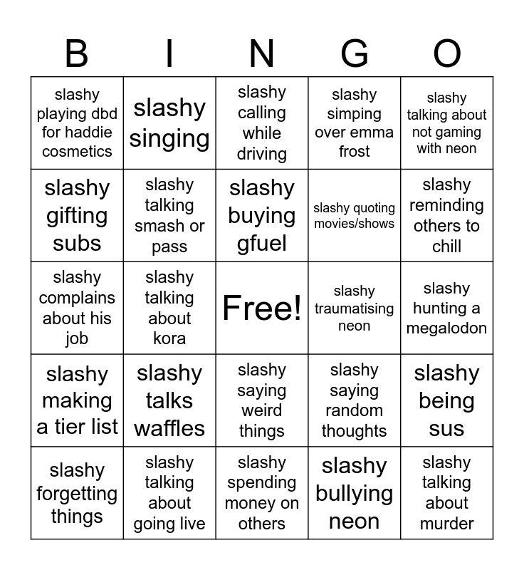 This bingo card has a free space and 24 words: slashy talks waffles, slashy talking about going live, slashy buying gfuel, slashy forgetting things, slashy talking about not gaming with neon, slashy playing dbd for haddie cosmetics, slashy gifting subs, slashy singing, slashy traumatising neon, slashy saying weird things, slashy quoting movies/shows, slashy complains about his job, slashy saying random thoughts, slashy being sus, slashy talking smash or pass, slashy bullying neon, slashy hunting a megalodon, slashy calling while driving, slashy reminding others to chill, slashy talking about kora, slashy talking about murder, slashy making a tier list, slashy simping over emma frost and slashy spending money on others.