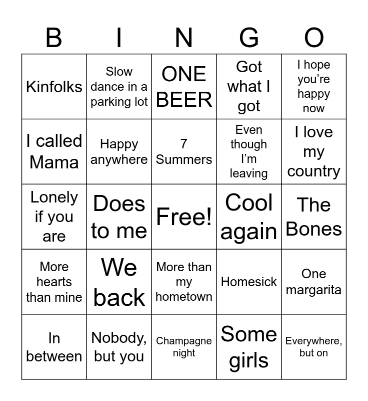 This bingo card has a free space and 69 words: I hope, The Bones, 10,000 hours, Chasin You, Nobody, but you, One man band, Got what I got, Die from a broken heart, I hope you’re happy now, One of them girls, One margarita, Hard to forget, Kinfolks, ONE BEER, Bluebird, Does to me, More than my hometown, Even though I’m leaving, Lovin On you, More hearts than mine, Cool again, Homesick, I love my country, Be a light, After a few, Beer, can’t fix, What she wants tonight, God whispered your name, Some girls, Pretty heart, Slow dance in a parking lot, Heartache medication, Here and now, Catch, One night standards, Love you like I used to, While we drink, One big country song, I called Mama, What if I never get over you?, We back, Everywhere, but on, Done, Homecoming queen, I should probably go to bed, In between, I wish grandpas never died, Ain’t always the cowboy, Homemade, Happy anywhere, 7 Summers, Make me want to, Ridin roads, Champagne night, Heartless, She’s mine, One thing, right?, Big big plans, Just the way, Lonely if you are, Better together, Monsters, Dive bar, Remember the young, GOOD TIME, Drinking alone, Almost maybes, Lady and Starting over.