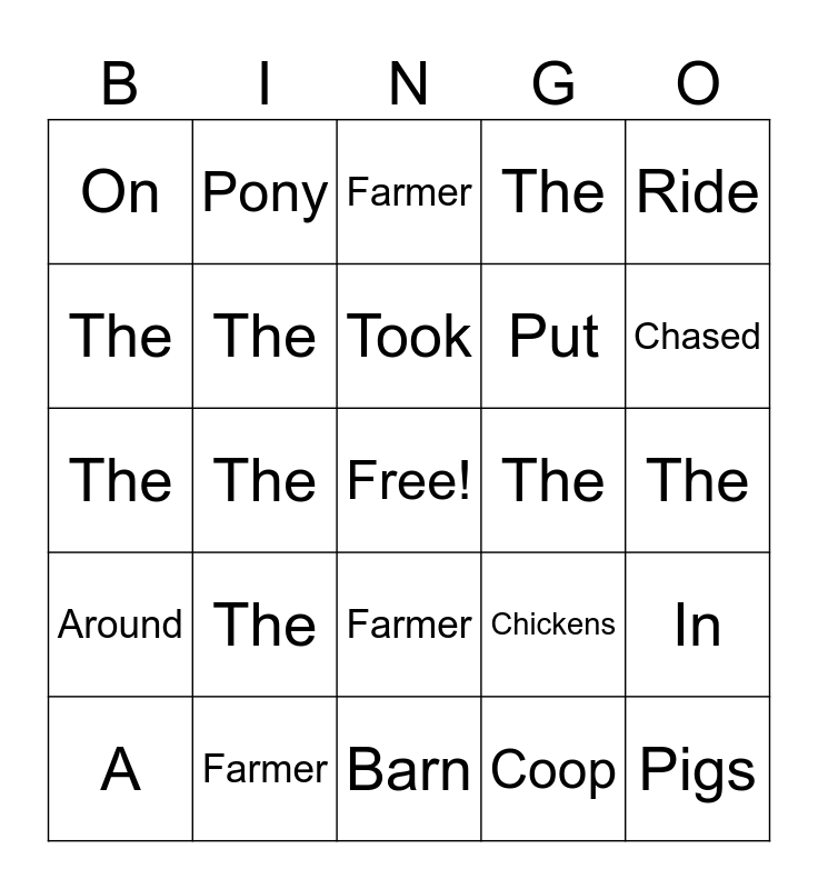 This bingo card has a free space and 24 words: The, Farmer, Took, A, Ride, On, The, Pony, The, Farmer, Put, The, Chickens, In, The, Coop, The, Farmer, Chased, The, Pigs, Around, The and Barn.