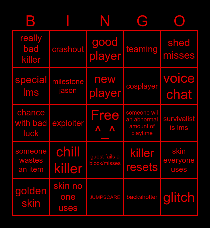 This bingo card has a free space and 24 words: chill killer, skin no one uses, new player, golden skin, shed misses, really bad killer, special lms, crashout, someone wil an abnormal amount of playtime, guest fails a block/misses, cosplayer, chance with bad luck, killer resets, skin everyone uses, milestone jason, backshotter, survivalist is lms, good player, voice chat, exploiter, glitch, someone wastes an item, teaming and JUMPSCARE.