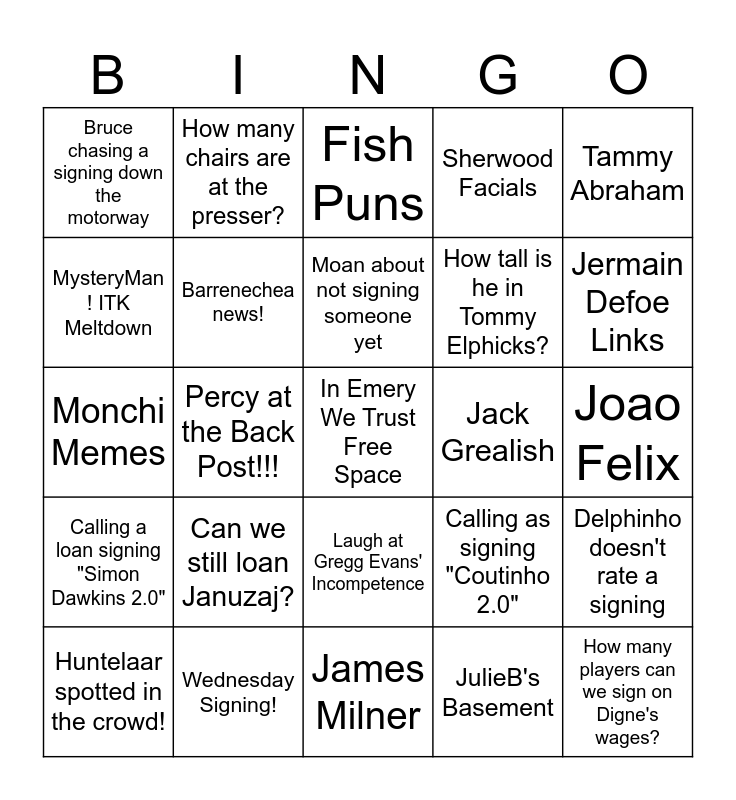 This bingo card has a free space and 24 words: Can we still loan Januzaj?, Wednesday Signing!, Moan about not signing someone yet, Huntelaar spotted in the crowd!, Tammy Abraham, Bruce chasing a signing down the motorway, MysteryMan ! ITK Meltdown, How many chairs are at the presser?, Jack Grealish, Laugh at Gregg Evans' Incompetence, How tall is he in Tommy Elphicks?, Monchi Memes, Calling as signing "Coutinho 2.0", Delphinho doesn't rate a signing, Barrenechea news!, JulieB's Basement, Joao Felix, Fish Puns, Jermain Defoe Links, Percy at the Back Post!!!, How many players can we sign on Digne's wages?, Calling a loan signing "Simon Dawkins 2.0", Sherwood Facials and James Milner.