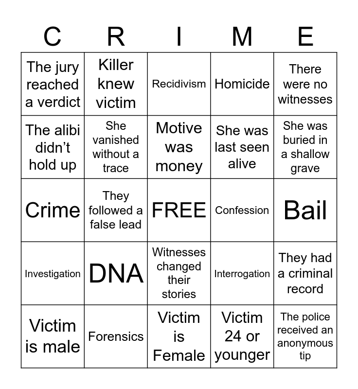 This bingo card has a free space and 123 words: Killer is male, Victim had children, Killer caught on camera, Motive was to keep a secret, Excessive stabbing/shooting, Victim easily could've lived, Killer knew victim, Murder weapon was a gun, Victim is Female, Motive was love/jealousy, Motive was revenge, Murder weapon was a knife, Killer was white, Killer tried to clean the scene, Victim was SA, Killer wasn't white, Victim is male, Killer took polygraph test and failed, Killer didn't know victim, Killer wore disguise, Victim 24 or younger, Motive was money, Killer was part of a gang, Killer tried to hide the body, Murder, Homicide, Forensics, Alibi, Suspect, Victim, Evidence, Crime, Investigation, Trial, Conviction, Sentence, Witness, Testimony, Autopsy, Criminal, Interrogation, Motive, Coroner, Detective, Prosecutor, Defense, Felony, Misdemeanor, Accomplice, DNA, Surveillance, Mugshot, Kidnapping, Assault, Robbery, Burglary, Fraud, Arson, Coldcase, Profiling, Parole, Warrant, Subpoena, Juror, CrimeScene, Confession, Stalking, Abduction, Bail, Plea, Jail, Prison, Recidivism, Infamous, The case went cold, DNA evidence was found, The suspect fled the scene, There were no witnesses, The murder weapon was missing, He confessed to the crime, It was a crime of passion, The body was discovered in a remote area, They had a criminal record, The alibi didn’t hold up, The motive remains unclear, The killer was never caught, She was last seen alive, The trial lasted for weeks, He pleaded not guilty, The crime shocked the community, Evidence was tampered with, They found blood at the scene, She vanished without a trace, The police received an anonymous tip, It was ruled a homicide, The defense argued self-defense, Surveillance footage was recovered, The killer returned to the scene, The case made national headlines, The investigation was reopened, Witnesses changed their stories, He was released on bail, The jury reached a verdict, The victim was targeted, The autopsy revealed foul play, There were signs of forced entry, They followed a false lead, The confession was coerced, They traced the phone records, He was arrested without incident, She had filed a restraining order, The crime was premeditated, A search warrant was issued, The suspect lawyered up, They discovered a hidden room, The fingerprints matched, The killer left a note, It became a high-profile case, The tip led to an arrest, The prosecution presented new evidence, The suspect had a history of violence, She was buried in a shallow grave and Justice was finally served.