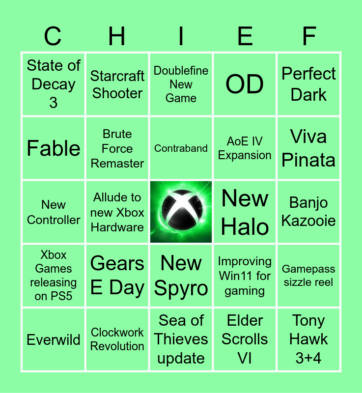 This bingo card has a free space and 24 words: Gears E Day, Clockwork Revolution, Contraband, Everwild, Perfect Dark, State of Decay 3, Fable, Starcraft Shooter, New Halo, New Spyro, AoE IV Expansion, New Controller, Improving Win11 for gaming, Gamepass sizzle reel, Brute Force Remaster, Elder Scrolls VI, Banjo Kazooie, Doublefine New Game, Viva Pinata, Allude to new Xbox Hardware, Tony Hawk 3+4, Xbox Games releasing on PS5, OD and Sea of Thieves update.