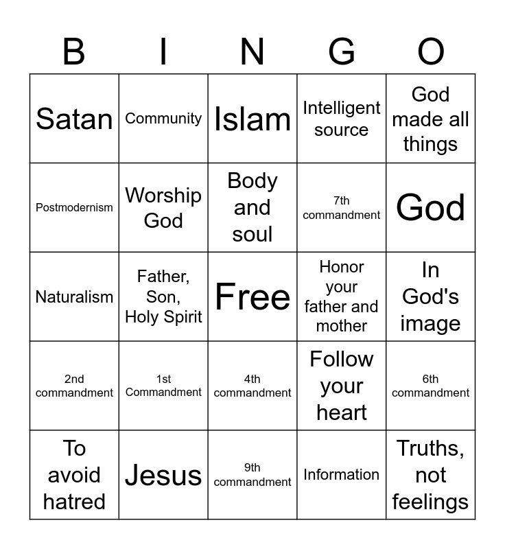 This bingo card has a free space and 24 words: 1st Commandment, Jesus, Body and soul, To avoid hatred, God made all things, Satan, Postmodernism, Community, Honor your father and mother, 4th commandment, 7th commandment, Naturalism, Follow your heart, 6th commandment, Worship God, Information, In God's image, Islam, God, Father, Son, Holy Spirit, Truths, not feelings, 2nd commandment, Intelligent source and 9th commandment.