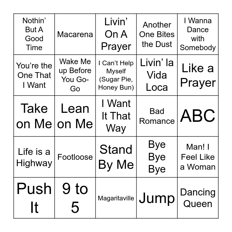 This bingo card has 75 words: Freedom!, Lovely Day, Livin’ On A Prayer, Don’t Stop Believin’, APT., I’m Walking on Sunshine, Sweet Dreams (Are Made of This), Girls Just Want to Have Fun, Shake it Off, Don’t Stop ‘Til You Get Enough, Dancing Queen, Play That Funky Music, I Can’t Help Myself (Sugar Pie, Honey Bun), You’re the One That I Want, I Will Survive, Lean on Me, Oops! I Did It Again, I Want It That Way, YMCA, I Wanna Dance with Somebody, Sweet Child O’ Mine, Take on Me, Wake Me up Before You Go-Go, Macarena, Another One Bites the Dust, Beat It, I Love Rock ‘N Roll, Take Me Home Country Road, Eye of the Tiger, Hungry Like the Wolf, Single Ladies, Uptown Funk, Free Fallin’, Bye Bye Bye, Like a Prayer, Livin’ la Vida Loca, Mambo No. 5 (a Little Bit of...), Uptown Girl, ABC, Jump, Hit Me With Your Best Shot, Any Way You Want It, Heaven Is A Place On Earth, We’re Not Gonna Take It, What Makes You Beautiful, Circle of Life, Push It, Nothin’ But A Good Time, Rock And Roll All Night, Barracuda, Happy, Stand By Me, Locomotion, Hey Jude, Do You Believe in Magic?, Here Comes the Sun, Sweet Caroline, Shout pt. 1 & 2, La Bamba, Firework, Footloose, Cake By The Ocean, I Gotta Feeling, Sugar, Party Rock Anthem, Bad Romance, All I Want For Christmas, My Heart Will Go On, Suspicious Minds, Man! I Feel Like a Woman, Life is a Highway, 9 to 5, Ring of Fire, Magaritaville and Shape of You.