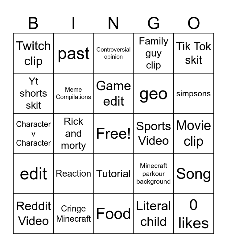 This bingo card has a free space and 24 words: Reaction, Cringe Minecraft, Game edit, Reddit Video, Tik Tok skit, Twitch clip, Yt shorts skit, past, Sports Video, Tutorial, geo, Character v Character, Minecraft parkour background, Song, Meme Compilations, Literal child, Movie clip, Controversial opinion, simpsons, Rick and morty, 0 likes, edit, Family guy clip and Food.