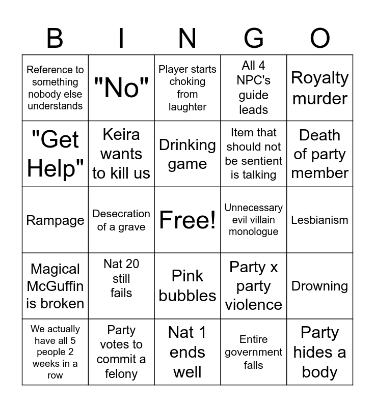 This bingo card has a free space and 24 words: Nat 20 still fails, Party votes to commit a felony, Drinking game, We actually have all 5 people 2 weeks in a row, Royalty murder, Reference to something nobody else understands, "Get Help", "No", Unnecessary evil villain monologue, Pink bubbles, Item that should not be sentient is talking, Rampage, Party x party violence, Drowning, Keira wants to kill us, Entire government falls, Lesbianism, Player starts choking from laughter, Death of party member, Desecration of a grave, Party hides a body, Magical McGuffin is broken, All 4 NPC's guide leads and Nat 1 ends well.