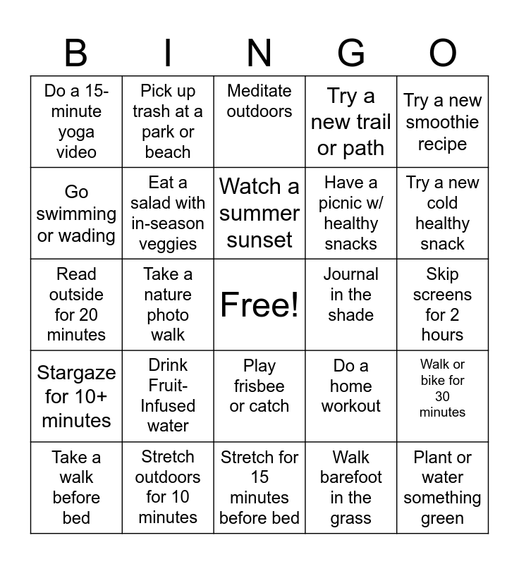 This bingo card has a free space and 24 words: Drink Fruit-Infused water, Stretch outdoors for 10 minutes, Watch a summer sunset, Take a walk before bed, Try a new smoothie recipe, Do a 15-minute yoga video, Go swimming or wading, Pick up trash at a park or beach, Journal in the shade, Play frisbee or catch, Have a picnic w/ healthy snacks, Read outside for 20 minutes, Do a home workout, Walk or bike for 30 minutes, Eat a salad with in-season veggies, Walk barefoot in the grass, Skip screens for 2 hours, Meditate outdoors, Try a new cold healthy snack, Take a nature photo walk, Plant or water something green, Stargaze for 10+ minutes, Try a new trail or path and Stretch for 15 minutes before bed.