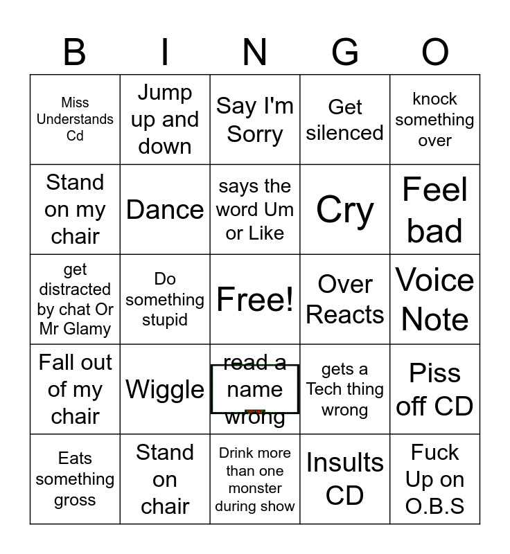 This bingo card has 1 images, a free space and 24 words: Wiggle, Stand on chair, says the word Um or Like, Eats something gross, knock something over, Miss Understands Cd, Stand on my chair, Jump up and down, Over Reacts, read a name wrong, Cry, get distracted by chat Or Mr Glamy, gets a Tech thing wrong, Piss off CD, Dance, Insults CD, Voice Note, Say I'm Sorry, Feel bad, Do something stupid, Fuck Up on O.B.S, Fall out of my chair, Get silenced and Drink more than one monster during show.