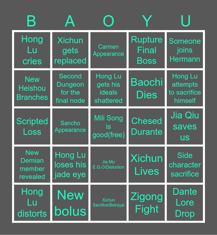 This bingo card has a free space and 24 words: Hong Lu loses his jade eye, New bolus, Hong Lu gets his ideals shattered, Hong Lu distorts, Someone joins Hermann, Hong Lu cries, New Heishou Branches, Xichun gets replaced, Chesed Durante, Jia Mu E.G.O/Distortion, Baochi Dies, Scripted Loss, Xichun Lives, Side character sacrifice, Second Dungeon for the final node, Zigong Fight, Jia Qiu saves us, Carmen Appearance, Hong Lu attempts to sacrifice himself, Sancho Appearance, Dante Lore Drop, New Demian member revealed, Rupture Final Boss and Xichun Sacrifice/Betrayal.