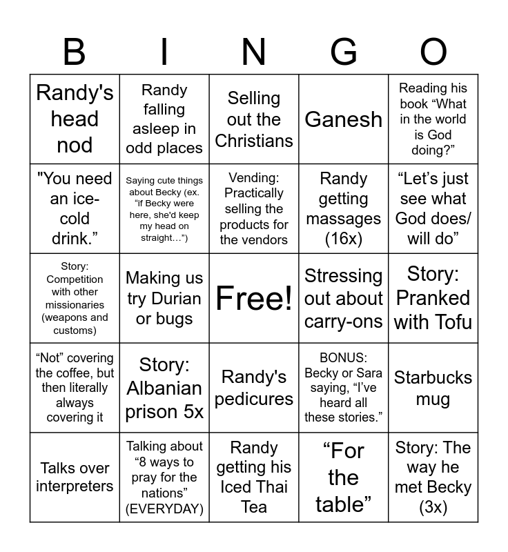 This bingo card has a free space and 25 words: Story: Albanian prison 5x, Randy getting his Iced Thai Tea, Vending: Practically selling the products for the vendors, Talks over interpreters, Reading his book “What in the world is God doing?”, Randy's head nod, "You need an ice-cold drink.”, Randy falling asleep in odd places, Stressing out about carry-ons, Randy's pedicures, Randy getting massages (16x), Story: Competition with other missionaries (weapons and customs), BONUS: Becky or Sara saying, “I’ve heard all these stories.”, Starbucks mug, Saying cute things about Becky (ex. “if Becky were here, she'd keep my head on straight…”), “Divine appointments”, Story: Pranked with Tofu, Selling out the Christians, “Let’s just see what God does/ will do”, Making us try Durian or bugs, Story: The way he met Becky (3x), Talking about “8 ways to pray for the nations” (EVERYDAY), “Not” covering the coffee, but then literally always covering it, Ganesh and “For the table”.