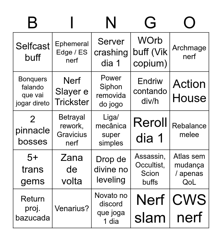 This bingo card has a free space and 24 words: Zana de volta, Venarius?, Power Siphon removida do jogo, Return proj. bazucada, Archmage nerf, Selfcast buff, Bonquers falando que vai jogar direto, Ephemeral Edge / ES nerf, Reroll dia 1, Drop de divine no leveling, Endriw contando div/h, 2 pinnacle bosses, Assassin, Occultist, Scion buffs, Atlas sem mudança / apenas QoL, Nerf Slayer e Trickster, Nerf slam, Rebalance melee, Server crashing dia 1, Action House, Betrayal rework, Gravicius nerf, CWS nerf, 5+ trans gems, WOrb buff (Vik copium) and Novato no discord que joga 1 dia.