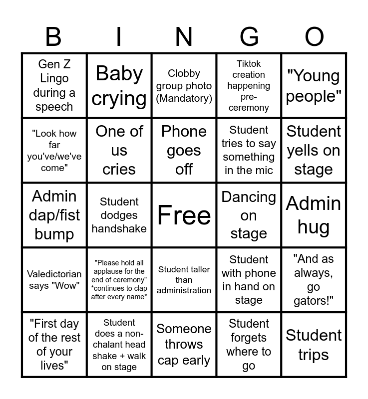 This bingo card has a free space and 24 words: "Please hold all applause for the end of ceremony" *continues to clap after every name*, Student does a non-chalant head shake + walk on stage, Phone goes off, "First day of the rest of your lives", "Young people", Gen Z Lingo during a speech, "Look how far you've/we've come", Baby crying, Dancing on stage, Student taller than administration, Student tries to say something in the mic, Admin dap/fist bump, Student with phone in hand on stage, "And as always, go gators!", One of us cries, Student forgets where to go, Admin hug, Clobby group photo (Mandatory), Student yells on stage, Student dodges handshake, Student trips, Valedictorian says "Wow", Tiktok creation happening pre-ceremony and Someone throws cap early.