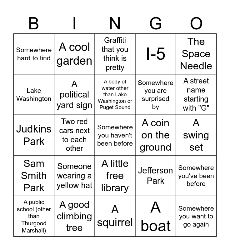 This bingo card has a free space and 29 words: A public school (other than Thurgood Marshall), A bird, Two red cars next to each other, A bus with three digits in its route number, Somewhere hard to find, Graffiti that you think is pretty, A political yard sign, Someone wearing a yellow hat, A coin on the ground, A good climbing tree, A swing set, Somewhere you want to go again, A squirrel, A boat, A street name starting with "G", A restaurant, A little free library, Sam Smith Park, The Space Needle, Judkins Park, Jefferson Park, Puget Sound, Somewhere you are surprised by, Lake Washington, I-5, A cool garden, Somewhere you've been before, A body of water other than Lake Washington or Puget Sound and Cal Anderson Park.