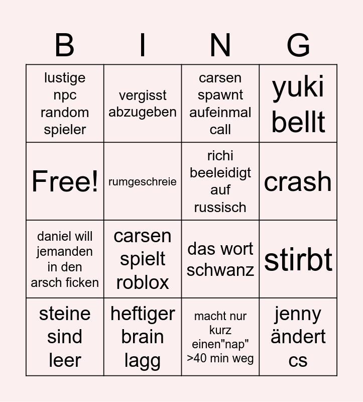 This bingo card has 16 words: heftiger brain lagg, stirbt, carsen spawnt aufeinmal call, lustige npc random spieler, daniel will jemanden in den arsch ficken, vergisst abzugeben, das wort schwanz, macht nur kurz einen"nap" >40 min weg, Free!, rumgeschreie, steine sind leer, yuki bellt, carsen spielt roblox, crash, richi beeleidigt auf russisch and jenny ändert cs.