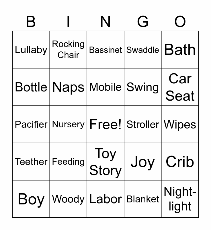 This bingo card has a free space and 29 words: Boy, Cry, Nursery, Formula, Lullaby, Bassinet, Naps, Feeding, Stroller, Woody, Wipes, Night-light, Labor, Blanket, Car Seat, Diaper, Toy Story, Teether, Bath, Pacifier, Joy, Newborn, Swing, Bottle, Swaddle, Rocking Chair, Crib, Mobile and Sleepless Nights.