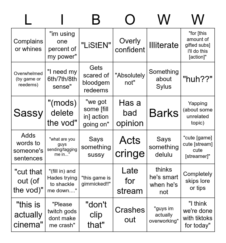 This bingo card has 36 words: Late for stream, "this game is gimmicked!!", Crashes out, Overwhelmed (by game or reedems), Adds words to someone's sentences, Has a bad opinion, "I need my 6th/7th/8th sense", "don't clip that", Illiterate, thinks he's smart when he's not, "huh??", Overly confident, Completely skips lore or tips, "(mods) delete the vod", "Absolutely not", Complains or whines, "cut that out (of the vod)", Barks, Sassy, "LiStEN", "we got some [fill in] action going on", "what are you guys sending/tagging me in...", Acts cringe, Says something sussy, Says something delulu, "im using one percent of my power", Something about Sylus, "Please twitch gods dont make me crash", Gets scared of bloodgem redeems, "for [this amount of gifted subs] i'll do this [action]", "I think we're done with tiktoks for today", "this is actually cinema", "cute [game] cute [stream] cute [streamer]", Yapping (about some unrelated topic), "(fill in) and Hades trying to shackle me down...." and "guys im actually overworking".