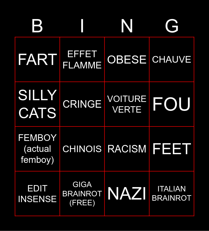This bingo card has 16 words: GIGA BRAINROT (FREE), FEET, OBESE, FART, FEMBOY (actual femboy), EFFET FLAMME, RACISM, NAZI, SILLY CATS, CRINGE, EDIT INSENSE, CHAUVE, CHINOIS, FOU, VOITURE VERTE and ITALIAN BRAINROT.