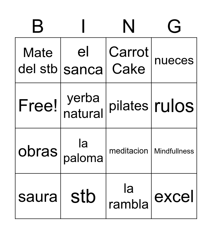 This bingo card has 16 words: stb, Mindfullness, Carrot Cake, Mate del stb, obras, el sanca, meditacion, la rambla, Free!, yerba natural, saura, nueces, la paloma, rulos, pilates and excel.