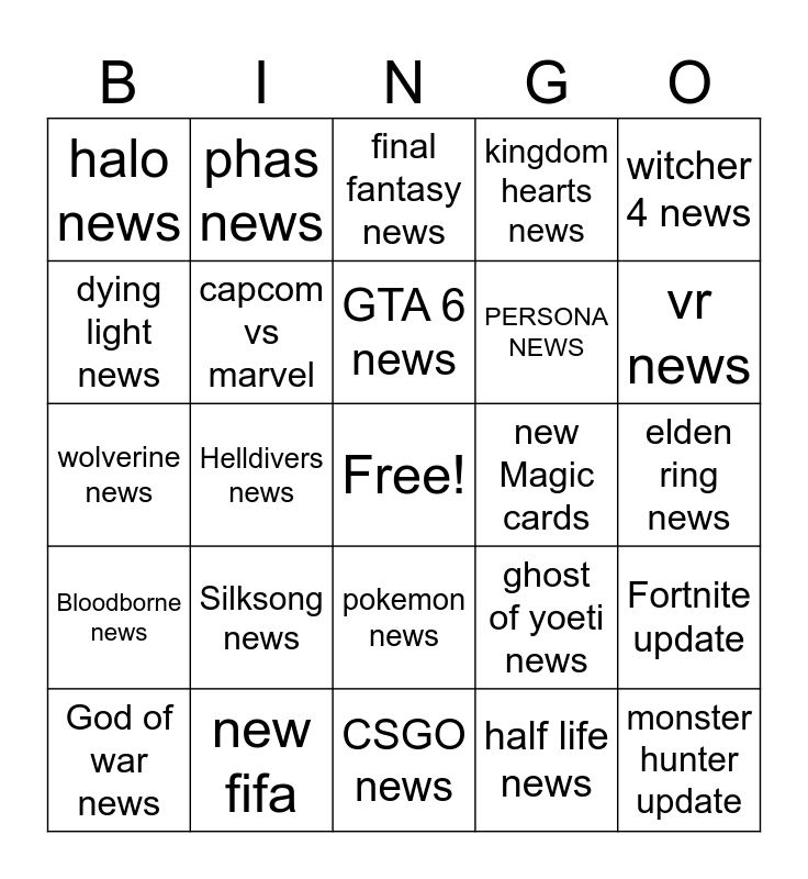 This bingo card has a free space and 24 words: Silksong news, new fifa, GTA 6 news, God of war news, witcher 4 news, halo news, dying light news, phas news, new Magic cards, pokemon news, PERSONA NEWS, wolverine news, ghost of yoeti news, Fortnite update, capcom vs marvel, half life news, elden ring news, final fantasy news, vr news, Helldivers news, monster hunter update, Bloodborne news, kingdom hearts news and CSGO news.
