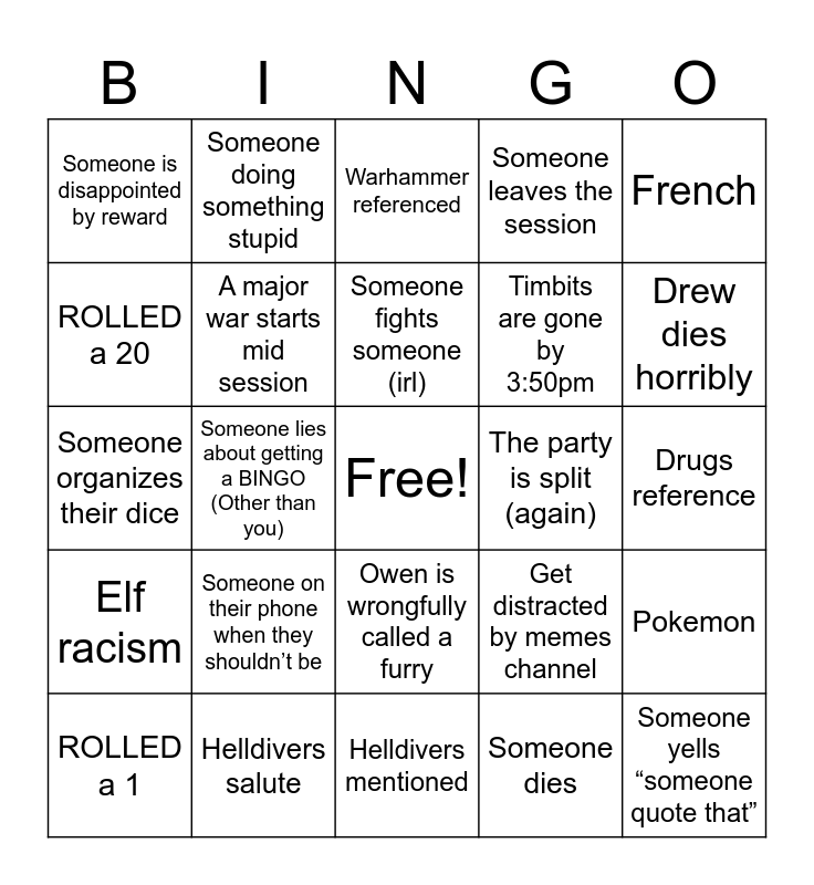 This bingo card has a free space and 29 words: ROLLED a 1, At least 10 new additions to the quote Chanel, Someone lies about getting a BINGO (Other than you), Dark humour, Someone is disappointed by reward, Warhammer referenced, A major war starts mid session, Someone on their phone when they shouldn’t be, The party is split (again), Helldivers salute, Drugs reference, Someone yells “someone quote that”, Helldivers mentioned, Someone dies, Drew dies horribly, Someone gets new dice, Owen is wrongfully called a furry, Elf racism, French, Someone organizes their dice, Get distracted by memes channel, Massive argument, Timbits are gone by 3:50pm, ROLLED a 20, Someone leaves the session, Someone doing something stupid, Pokemon, Someone fights someone (irl) and Someone else has gotten a bingo before you.