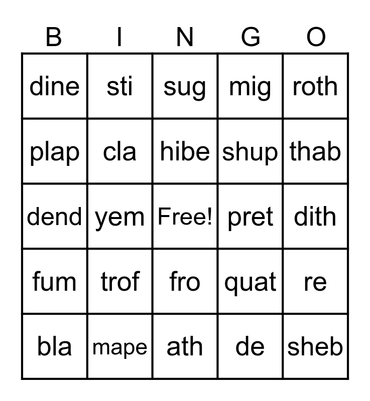 This bingo card has a free space and 29 words: lo, mape, sug, tile, roth, dine, cla, hibe, pret, re, bla, yem, de, sheb, dend, jecl, ath, quat, thab, fum, trof, cro, shup, dith, plap, sti, fro, mig and mote.